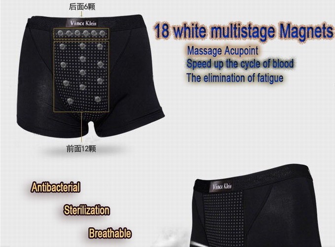With the presence of 18 pieces of strong magnets, this underwear could gradually adjust magnetic field of the human body. It is designed to promote blood circulation, increase virility and help you reclaim the bedroom. It produces a magnetic field that acts as an anti-inflammatory, eliminates prostate illness and rapidly kills bacteria and infections. It can take care of your prostate and testicle for 24 hours, to protect of the health of men's "Golden Triangle". After using for a period of time, it would make men feel more energetic and powerful. Every man should have a try.